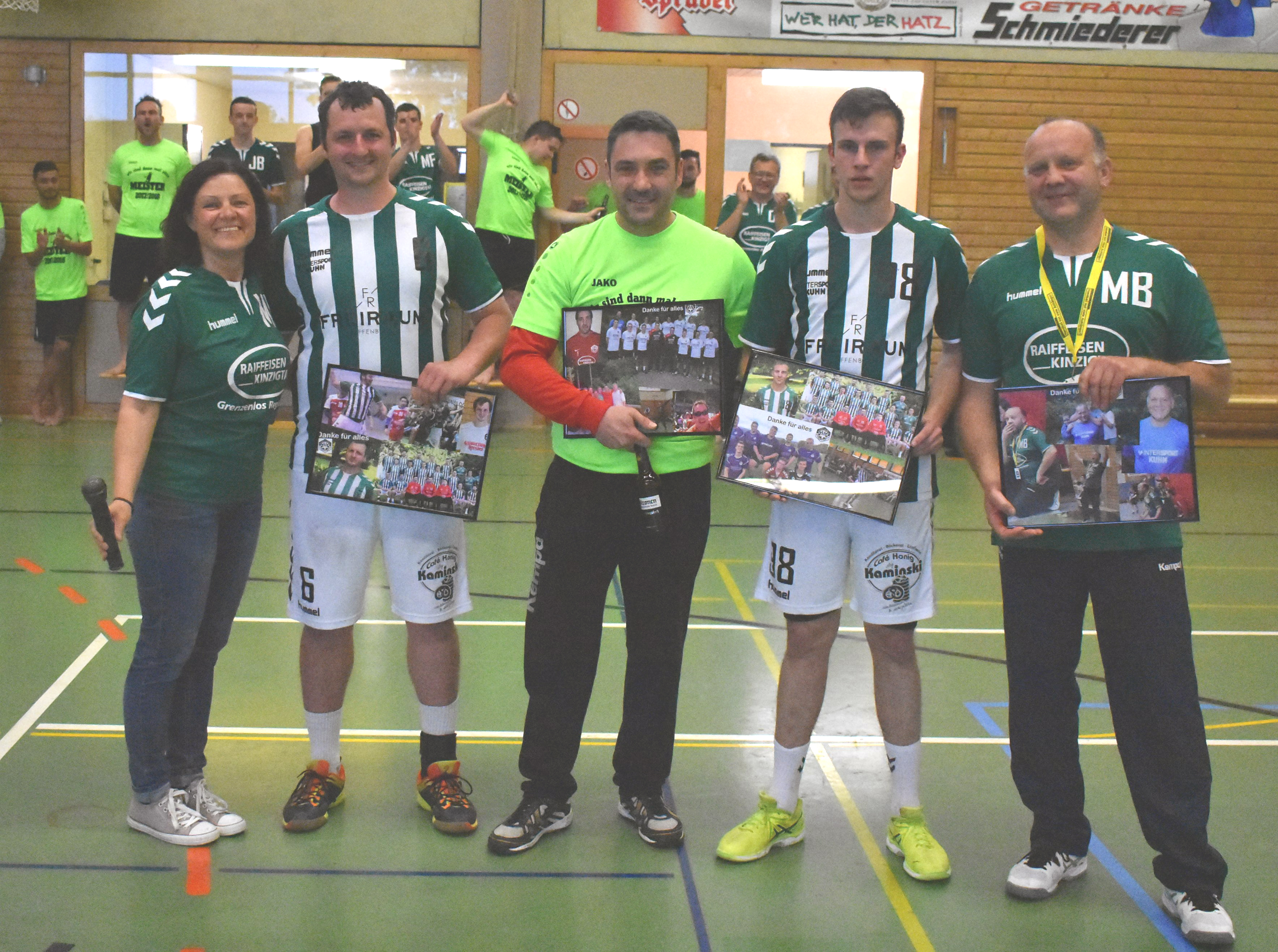 Vor dem letzten Heimspiel wurden Felix Möschle (Karrierende) und Philipp Fautz (zurück nach Schutterwald) verabschiedet. Und auch die Trainer Michael Boschert und Oliver Pfeiffer erhielten von Abteilungsleiterin Monika Berger eine Collage als Dankeschön.